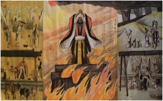 《吕氏春秋·顺民》记载说:“昔者,汤克夏而正天下,天大旱,五年不收。汤乃以身祷于桑林曰:‘余一人有罪无及万夫;万夫有罪在余一人。无以一人之不敏,使上帝鬼神伤民之命。’于是翦其发,枥其手,以身为牺牲,用祈福于上帝。民乃甚说,雨乃大至。”