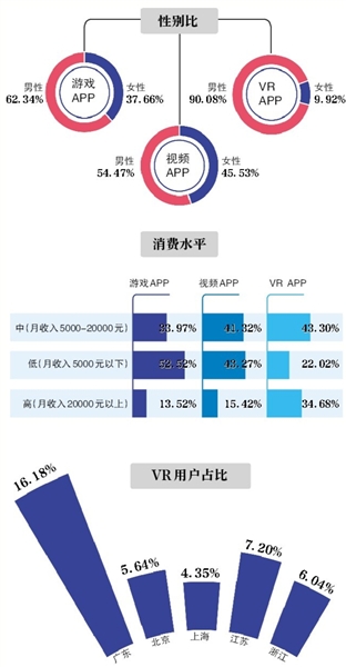 而VR的普及程度也与地域硬件发展有直接的关系:广东省的电子科技和智能硬件较发达,VR的用户中有16%都来自广东;而北京只占5%,上海则占4%。