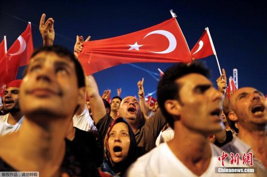 7月17日消息,当地时间7月16日,土耳其政府宣布挫败由部分军方人士发动的军事政变,2800多名军人因涉嫌参与政变遭逮捕。土耳其总理称,情况已经“完全得到控制”。此次政变造成了严重伤亡。图为当地民众聚集在塔克西姆广场谴责军事政变。