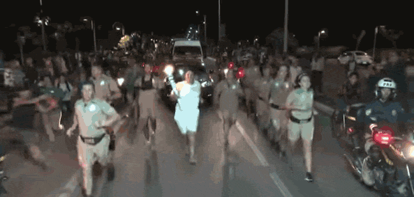 当里约奥运的圣火一路来到巴西南部城市若茵维莱时,一名身份不明的路人从人群中冲了出来,一直闯到了距火炬只有约两米的距离。