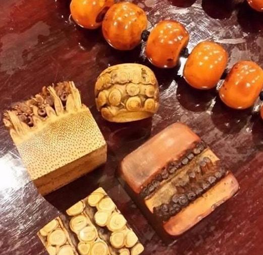 图片中右上角的蜜蜡珠子尺寸可是挺大的。这些竹制品看起来怎么有些密集恐惧的感觉!