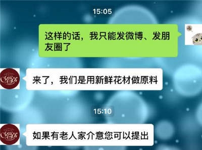 随后,傅小姐在微信上向蛋糕店投诉,强调菊花是用来扫墓的。蛋糕店先是回复称,那个花不是菊花,更不是全白的菊花,后又承认那是雏菊,雏菊的花语是纯洁的美……并解释:“扫墓没人拿雏菊?!奔案獾瓴豢系狼福敌〗憬耸乱约暗案馔计?、店家留言记录截图等发至微博。