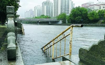 暴雨之下,东二环护城河水位急剧升高,水已经漫过了河边健身步道。