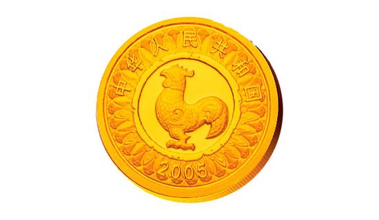 2005年乙酉(鸡)年彩金币的面额50元,成色99.9%,重1/10盎司,发行量30000枚,实铸量30000枚,委托瑞士FAUDE&HUGUENIN公司铸造。金币背面主题图案是由上海造币有限公司著名设计大师罗永辉先生设计的彩色雄鸡图。