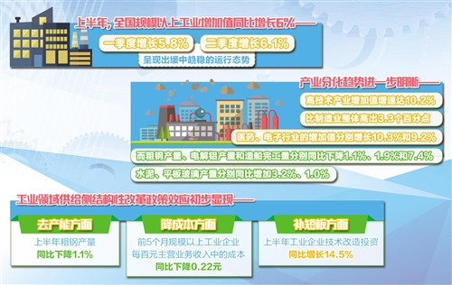 上半年,工业领域供给侧结构性改革政策效应初步显现:去产能扎实推进,降成本掷地有声,补短板抓铁有痕,积极的迹象明显增多。值得一提的是,工业领域不同产业间、同一产业内部分化加快,这是经济发展的客观规律使然,也是市场引导的作用,更是推动结构优化的良机。