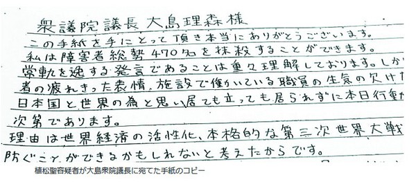 据媒体透露,植松圣曾于今年2月拿着一封信拜访了众议院议长的官邸,信的主题是“创造残疾人可以安乐死的世界”。在信中,他写道:“我的目标是实现残疾者在家庭生活及社会活动都非常困难的情况下,得到?;と送夂笕盟墙邮馨怖炙赖氖澜?。”他说这样做的理由是“为了让世界经济有活力,防止第三次世界大战”。他列举了“津久井山百合园”等两所设施,称“这些是我的作战目标”。他还说,在该福利院工作的职员没有活力。最后他写道:我要去职员很少的夜勤值班了。