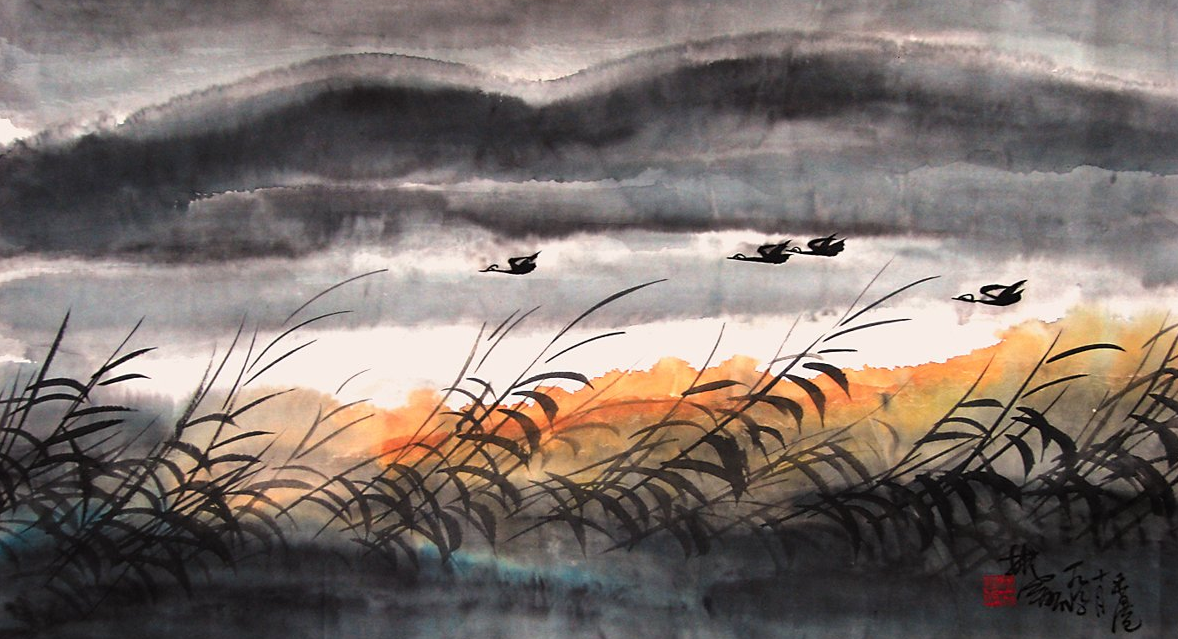 而图二的芦苇荡笔墨的处理上却能高水平地营造出一种特殊的戏剧性效果,虚实相生,烟雾弥漫,杆叶有深有浅,芦苇在衬托飞鸟中更是达到了形神兼备的境界,最大的亮点是把飞掠而过的芦雁,置身于一抹“天地极光”当中,显得黑白对比强烈,从而使命运寄寓逆风中的飞鸟身上,而让主题更加突出,在观赏中仿佛听到了音乐优美和舒展的主旋律和浑厚的副旋律混响的声音。图二是一幅对生命的礼赞和讴歌的作品,是艺术家命运的交响曲。