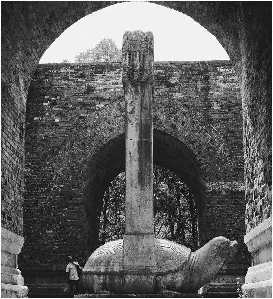 四方城内是“大明孝陵神功圣德碑”,碑文由明成祖朱棣亲自撰写,歌颂其父、明开国皇帝朱元璋一生的丰功伟绩。神功圣德碑是南京地区体量最大的明代碑刻之一,由碑额、碑身、碑座组成,碑座为龟趺,高达2.08米,宽2.54米,长5.15米。神功圣德碑的这只龟趺,艺术价值很高。