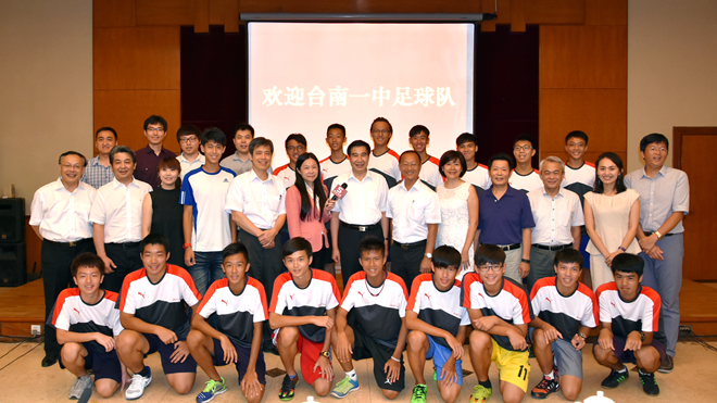 7月25日下午,台盟中央与台南一中足球队师生在台盟中央机关礼堂进行体验式交流座谈。全国政协常委、台盟中央常务副主席黄志贤,台盟中央宣传部副部长吴艺煤以及台南一中校长张添唐、校董事会会长郑群亮等出席。