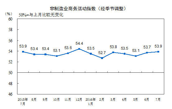 中新网8月1日电 据统计局网站消息,7月份,中国非制造业商务活动指数为53.9%,比上月上升0.2个百分点,连续两个月回升,非制造业稳中向好,增速略有加快。