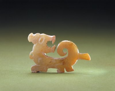 器为白玉质,但已沁为黄褐色。扁薄片状的造型将一只扭头卷尾的玉虎打造得栩栩如生?;⒄趴冢昧昕椎墓ひ罩瞥煽谥械睦?。椭圆形眼,蘑菇状角。胸前凸起一环形小穿,可供系挂。尾一侧琢出一小尖刀,刀刃部两面磨薄,使之兼具一定的实用功能。这件玉刻刀虽然外形似虎,但由于头上有蘑菇状角,所以也有人认为是龙与虎的结合体。