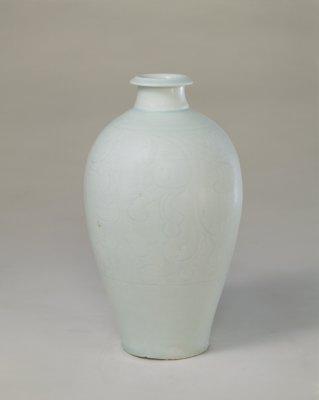 瓶形似橄榄,圈足。胎为灰褐色,施白色化妆土。瓶身刻划二虎,一站立,一行走,呲牙翘尾,均矫捷凶猛, 搏斗于草丛中,衬以洞石、芭蕉,近底处有一周莲瓣纹。图案以外空白处戳印珍珠形小圆圈。