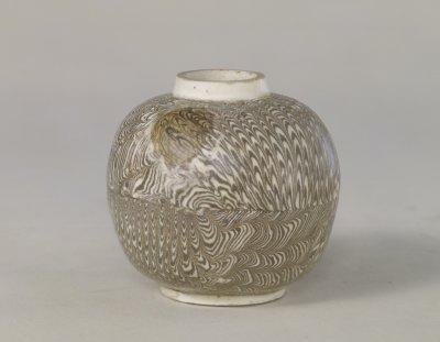 罐小口,丰肩,鼓腹,平底。口、底部施白釉,罐身以褐、白两色泥料揉绞出有如羽毛样花纹,新颖奇特。绞胎工艺始于唐代,借鉴漆器犀毗工艺,以不同颜色的胎土绞成各种图案,如羽毛纹、树叶纹、木纹、云朵纹等。