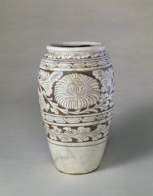 缸唇口,溜肩,深腹,圈足。灰褐胎,施白色化妆土。外壁通体以剔花装饰,器口至腹部共剔纹饰5层,依次为花叶纹、回纹、缠枝牡丹、回纹、花叶纹。此罐色彩鲜明,对比强烈,纹饰繁缛生动。