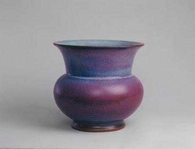 尊仿青铜器式样,口沿外撇,直颈,鼓腹,圈足。器内外通体施铜红窑变釉??谘叵轮辆辈恳蕴炖队晕?,晕散数道玫瑰紫红釉。腹部则主要施玫瑰紫红釉。器内兼施玫瑰紫与天蓝色釉。底刻“六”字款并有五孔。