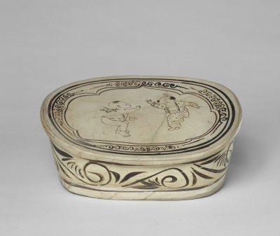 枕呈腰圆形,枕面前低后高。白釉,枕面及枕侧以黑彩绘婴戏纹。枕面外周以双线勾勒如意形开光及双弦纹,开光与弦纹间饰四组卷枝纹。枕侧绘简单的花草纹。枕 面主题纹饰画笔简练,描写两个婴孩玩耍,其中一孩儿头上落一只小鸟,孩儿惊愕不已,另一孩儿作兴奋状,欲上前捕捉小鸟。