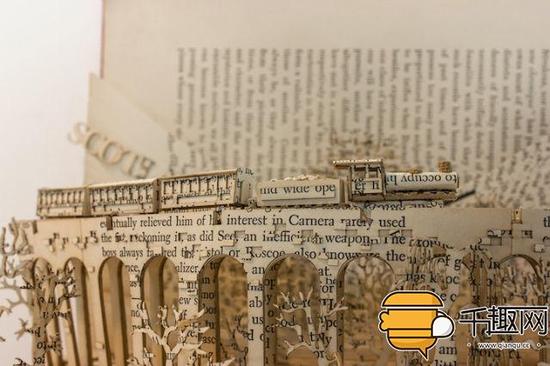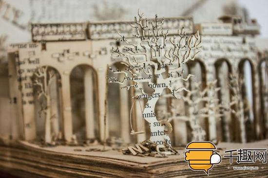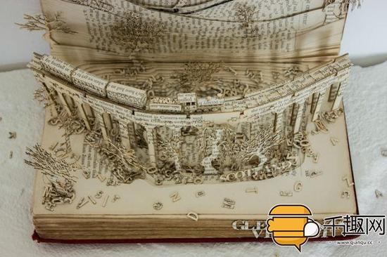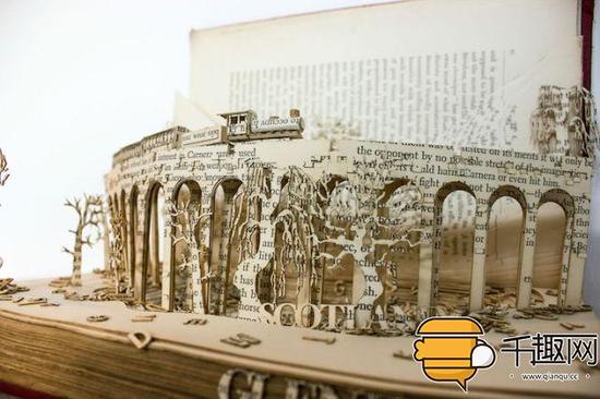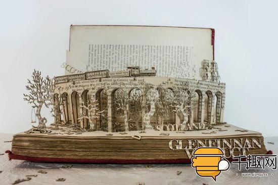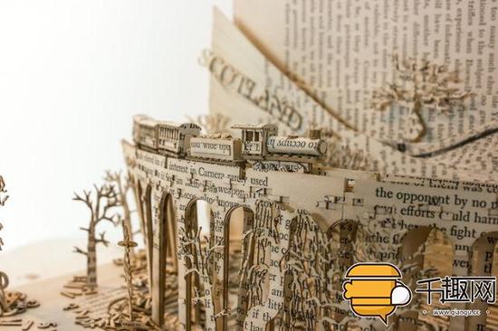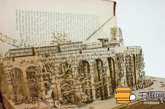 你要想问“如何描述苏格兰的记忆”,Wightman选了一本古董书进行创作,雕刻的桥页,配有一个微小的、复杂的火车。从分层背景看地形破裂的连绵山峰, 生动形象的树,分散包围的字母,留下一个个暗示故事的变形,衬底的独特文化,像是从过去到现在到未来。使用古董书进行雕刻极具韵味,书页上的文字给人耳目一新的感觉。