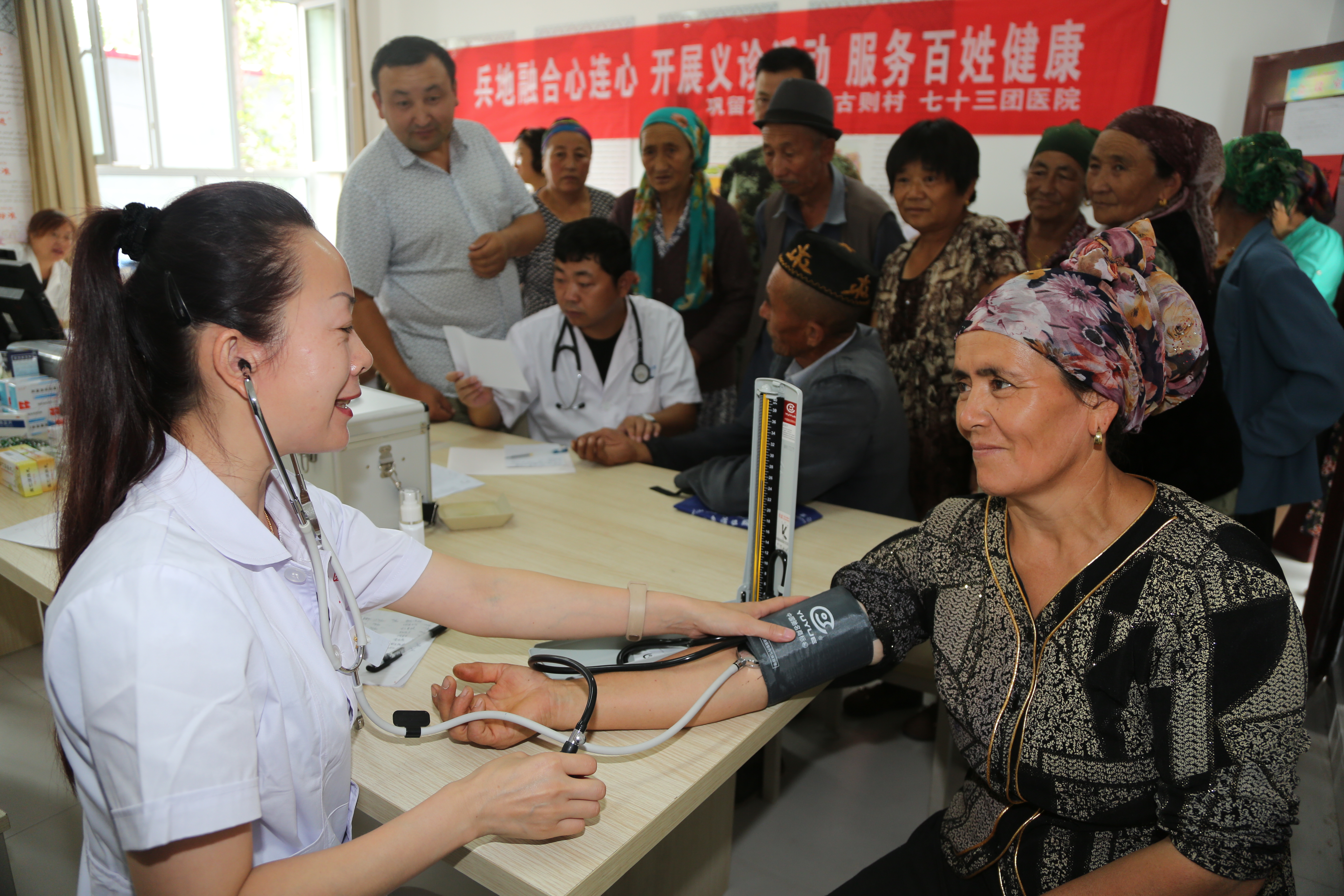 日前,江苏省镇江市第一人民医院首批对口支援新疆伊犁七十三团的两名医疗专家和该团医院的5名医护人员,来到离团场6公里远的巩留县提克阿热克乡莫因固则村开展“兵地融合心连心”义诊活动。援疆医生为村民开展了量血压、血细胞分析、心电图等常规病的检查分析,并为他们免费送上康复药品,受到群众欢迎。谭冬初 代红斌摄