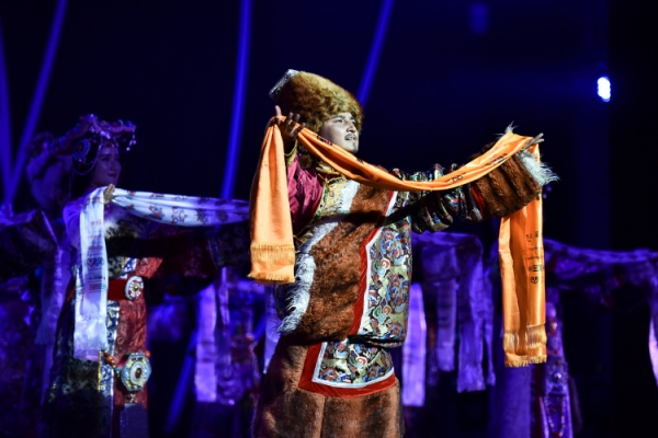8月8日,青海省西宁艺术剧院歌舞团在开幕式上表演开场舞蹈《祝颂》。