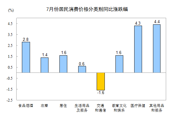 7月份,食品烟酒价格同比上涨2.8%,影响CPI上涨约0.83个百分点。其中,畜肉类价格上涨11.3%,影响CPI上涨约0.51个百分点(猪肉价格上涨16.1%,影响CPI上涨约0.42个百分点);水产品、鲜果、粮食价格分别上涨5.8%、0.5%和0.4%,合计影响CPI上涨约0.12个百分点;鲜菜、蛋价格分别下降4.3%和2.0%,合计影响CPI下降约0.11个百分点?! ?月份,其他七大类价格同比六涨一降。其中,其他用品和服务、医疗保健、居住、教育文化和娱乐、衣着、生活用品及服务价格分别上涨4.4%、4.3%、1.6%、1.6%、1.4%、0.6%;交通和通信价格下降1.6%。