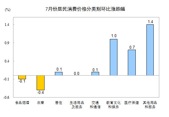 7月份,食品烟酒价格环比下降0.1%,影响CPI下降约0.03个百分点。其中,畜肉类价格下降1.3%,影响CPI下降约0.07个百分点(猪肉价格下降2.1%,影响CPI下降约0.06个百分点);鲜果价格下降1.9%,影响CPI下降约0.03个百分点;蛋价格下降1.5%,影响CPI下降约0.01个百分点;鲜菜价格上涨3.8%,影响CPI上涨约0.08个百分点;水产品价格上涨0.6%,影响CPI上涨约0.01个百分点?! ?月份,其他七大类价格环比五涨一降一平。其中,其他用品和服务、教育文化和娱乐、医疗保健、居住、交通和通信价格分别上涨1.4%、1.0%、0.7%、0.1%、0.1%;衣着价格下降0.4%;生活用品及服务价格持平。