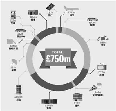 图为伦敦奥运会消费者支出明细,f为英镑符号,m为百万英镑,伦敦奥运会期间,消费者总支出为7.5亿英镑