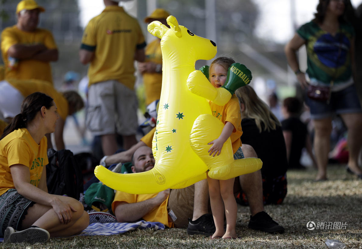 3岁的索菲怀抱澳大利队吉祥物充气袋鼠为妈妈加油。