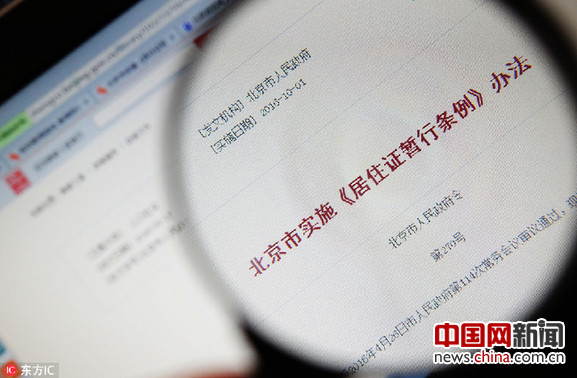 2016年8月11日,北京市政务门户网站上公布的《北京市实施《居住证暂行条例》办法》。图片来源:东方IC