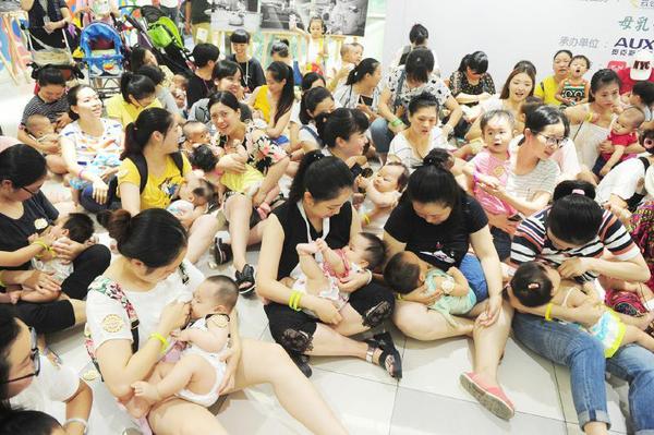 8月6日上午,成都近百位哺乳期的妈妈们在高新区一商场内,集体给自己的宝宝喂奶,呼吁更多的人支持母乳喂养,尊重哺乳。