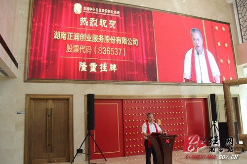 2016年8月9日上午,湖南正润创业服务股份有限公司董事长彭志林在全国中小企业股份转让系统中心敲响了开启“正润创服”挂牌交易的钟声。自此,正润创服成为全国首批创新创业服务类上市企业、湖南省创新创业服务第一股。湘乡市人民政府副市长谢北葵,湘乡经开区党工委副书记、管委会副主任王建国,企业股东代表、券商代表应邀参加了挂牌仪式。