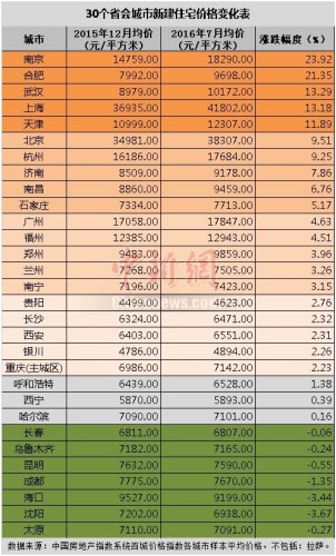 中新网记者梳理国内30个省会城市(包括直辖市、首府;不包括“拉萨”,因缺乏数据)今年以来新房价格走势情况发现,南京、合肥、武汉三个省会城市的今年房价涨幅超过了北京、上海、天津三个直辖市。跃升为楼市“四小龙”中的南京、合肥房价涨价超两成,每平米分别涨到18290元、9698元。其中,南京房价超过广州,仅次于上海、北京。