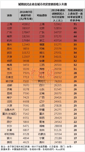 不谈各个城市是否存在限购等政策,若按各地2015年城镇居民人均可支配收入计算,北京、上海、广州城镇居民人均可支配收入较高,但买房承担的压力依然居前几位。北京为例,城镇居民靠一人工作赚钱全额付款买90平米的房子需要攒钱65年,如果夫妻两人共同承担则工作近7年的收入就可付20%的首付款购买首套房。