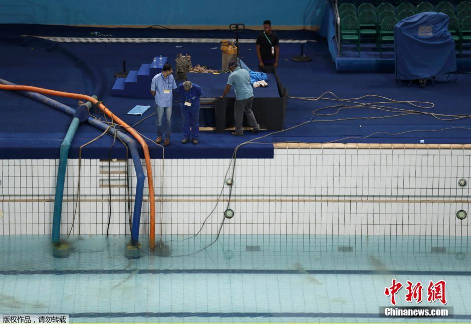 2016年8月14日,巴西里约热内卢,2016里约奥运会,奥运会游泳比赛结束,工作人员抓紧给游泳换水,以迎接接下来开始的花样游泳比赛。