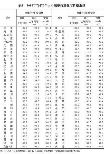 中新网8月18日电 据统计局网站消息,与上月相比,7月份,70个大中城市中,新建商品住宅价格下降的城市有16个,上涨的城市有51个,持平的城市有3个?;繁燃鄹癖涠校罡哒欠?.6%。同比价格变动中,最高涨幅为41.4%,最低为下降3.8%。