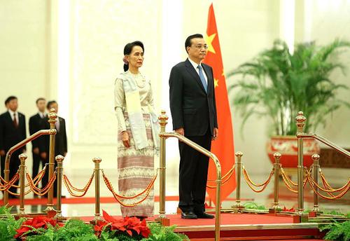 【李克强举行仪式欢迎缅甸国务资政昂山素季】国务院总理李克强18日下午在人民大会堂北大厅举行仪式,欢迎来华进行正式访问的缅甸联邦共和国国务资政昂山素季。双方在会谈中一致同意,本着和平共处五项原则精神,坚持相互尊重,巩固政治互信,加强交流合作,推动中缅关系在新时期取得更大发展。