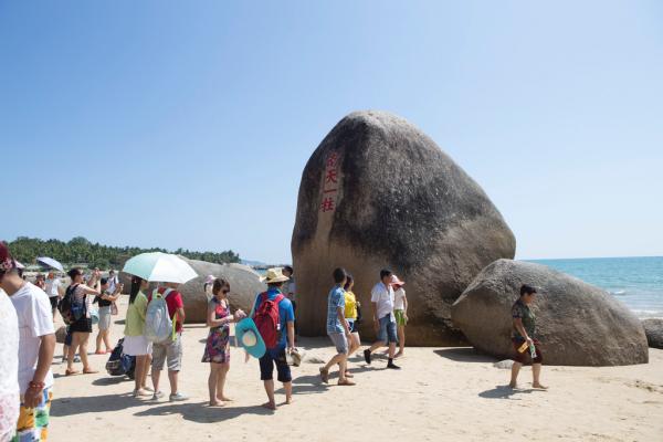 海南三亚天涯海角景区,游客在南天一柱景点前游玩。