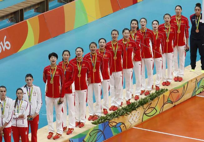 8月20日,中国女排队员在升国旗仪式上唱国歌。 当日,在2016年里约奥运会女子排球决赛中,中国队以3比1战胜塞尔维亚队,夺得冠军。新华社记者沈伯韩摄