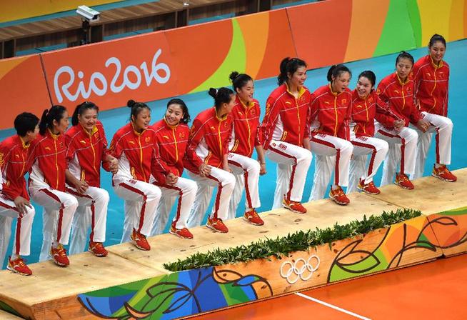8月20日,在2016年里约奥运会女子排球决赛中,中国队以3比1战胜塞尔维亚队,夺得冠军。这是中国队员登上颁奖台。 新华社记者韩瑜庆摄