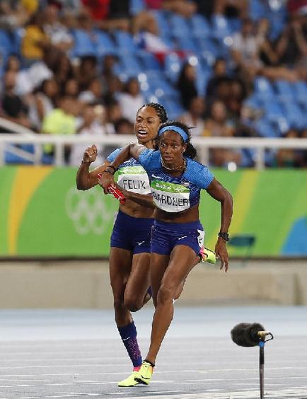 8月18日,美国队选手费利克斯(左)在比赛中与队友加德纳交接棒。当日,在2016年里约奥运会田径女子4X100米接力预赛后,美国女队经过申诉进行单独重赛,并以41秒77的成绩晋级决赛。新华社记者韩岩摄