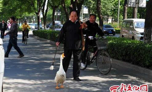 2014年5月5日,在河北石家庄六旬老人张士君正和他的爱鹅遛弯回家。据老人介绍,这支大白鹅已经三岁了,每天都会带着它出去散步,一走就是几十里地。它毛发鲜亮,器宇轩昂,很通人性,遇见“朋友”便会鞠躬打招呼;每当老人呼唤它的名字,大白鹅都会应声回答,并会准确按照主人的命令行动。张士君表示,彻彻(鹅)每天陪伴自己,带来了无穷的快乐,积极乐观的心态让自己更加健康年轻。