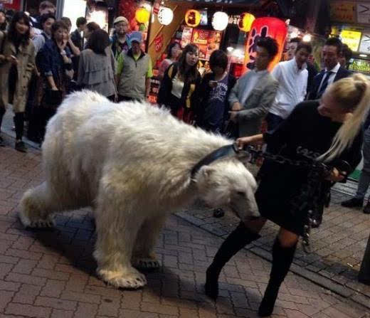 遛熊者是一位穿短裙的金发年轻女性,T恤衫上有“LALSH”组织的标识,该组织还和戴项圈的北极熊摆出合影的姿势让行人拍照。他们曾在自己的“脸谱”网上贴出在横滨牵北极熊逛街的图片,也引起不小的轰动。
