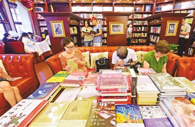 8月18日,一名外国读者(右)在书店阅读书籍。