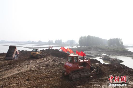8月18日,武警水电七支队110名官兵正式进驻湖北天门汉北河龙骨湖分蓄洪区,对分洪口进行封堵复堤。图为分洪口封堵复堤工作正在进行。田端磊 摄