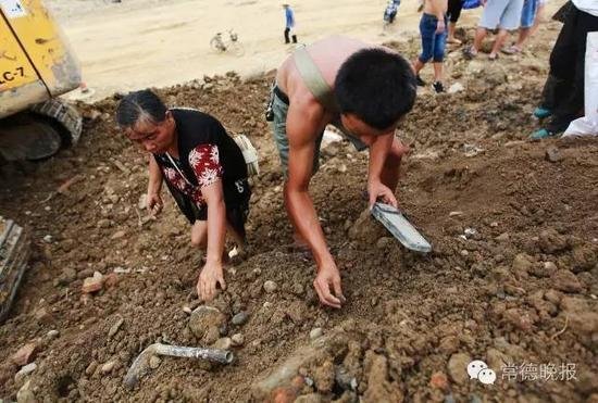 8月20日下午3时许,记者来到现场。在一处立交桥西边的护坡上,云集了几十位村民,他们带着各式工具不停的挖掘翻找,有的已经提着一塑料袋“凯旋而归”?!按右桓鲂瞧谇熬陀腥朔⑾至?,最开始就几个人来挖,消息传开了来的人就越来越多了。”村民陈女士告诉记者。