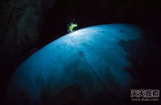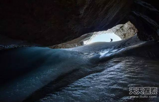 其中一位探险家说,洞口的冰就像一个巨人的巨大蓝舌头,再往下就是万丈深渊。它们的表面非常干净,就像有一层液体,但其实是一层坚硬的冰。