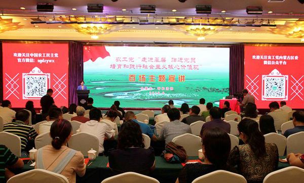 2016年8月19日下午,农工党“走进基层,贴近党员,培育和践行社会主义核心价值观”百场主题宣讲走进祖国美丽北疆内蒙古。宣讲团由全国政协委员、农工党中央常委、研究室主任游宏炳,农工党广东省委常委、中山大学附属第一医院博士生导师秦鉴,内蒙古自治区政协委员、内蒙古自治区血液中心血液办主任陶迎春组成。中共内蒙古自治区党委统战部党派处调研员格日勒等应邀出席宣讲会。此次宣讲由农工党中央宣传部信息处处长谢英伟主持,农工党内蒙古自治区委会专职副主委王学东致辞。