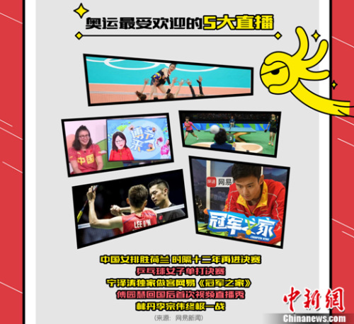 里约奥运会网易新闻分别布局了前方直播访谈节目《冠军之家》及“16×24直击里约”不间断直播间,除赛事直播外,娱乐、时尚、财经、旅游多个频道联合,邀请各领域名人坐镇从不同角度解读奥运,《奥运下午茶》等直播节目成为赛事间隙网友们不可或缺的内容大餐。此外,聊球吧等多个PGC直播节目也在奥运期间大放异彩,结合热点话题多次引爆聊天室。奥运期间,“女子排球半决赛:中国VS荷兰”、“乒乓球女子单打决赛”、宁泽涛独家做客网易《冠军之家》、“傅园慧回国首次直播秀”、”林丹李宗伟终极一战”等成为最受网友欢迎的直播节目。