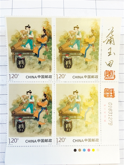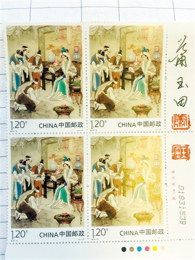 说到这套邮品,不得不说它的设计者,中国工笔画学会常务副主席蒲玉田老师,他用工笔画画法,画面精细,色彩古色古香(淡红褐色为主),表现了工笔画细腻的 特点,如同一句名言“大画要当小画去画,小画要当大画去画”,尤其是小型张“归省庆元宵”一方是设计者蒲玉田的签名加盖朱红印章,另一方是“红楼梦中国古 典文学名著”的字,显得画面左右对称,更加完美。另外,四方邮品也加盖印章与签名,真让我这个邮票爱好老者爱不释手!
