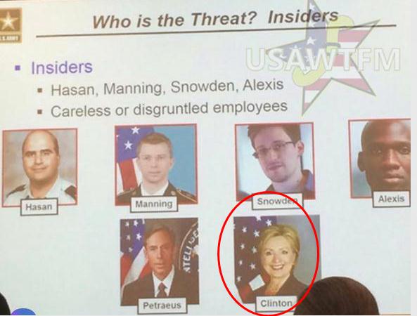 美军方一组内部培训幻灯片资料外泄,图片上希拉里·等被军方描述成是美国国家安全威胁。