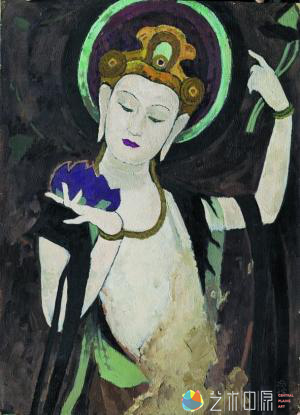 靳尚谊表示,临摹作为重要的方法,可以着重解决色彩问题,而这也使得临摹图片或照片会有很大的局限。于是,靳尚谊特意去了敦煌临摹壁画,直面古代的原作,用写实的方式把敦煌那些已经氧化破损、被烟熏黑的图像以及墙上斑斑驳驳的景象描绘出来。在余丁看来,“这几张敦煌壁画的临摹本,是迄今比照片及其他摹本更接近壁画原作的图像?!?/p>